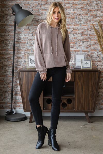 Heimish Full Size Ribbed Drawstring Kangaroo Pocket Hoodie